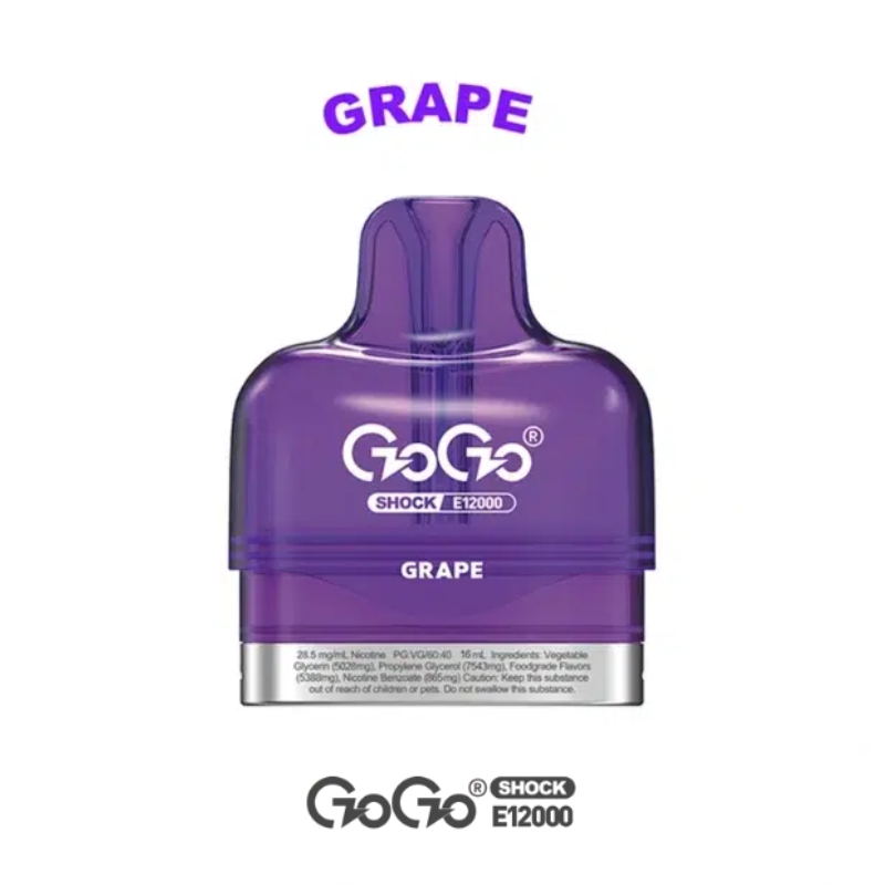 Grape – GOGO Shock E12000 Pod: Reife violette Trauben vereinen süße und leicht säuerliche Noten, mit einem sanften, vollmundigen Geschmack – frisch und nicht zu süß, ideal für längeren Genuss.