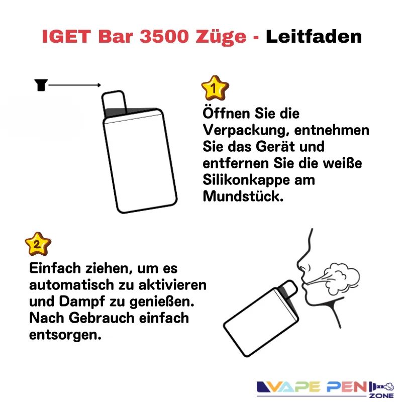 - Wählen Sie aus 34 reichhaltigen IGET Bar Geschmacksrichtungen, um Ihre Geschmacksknospen